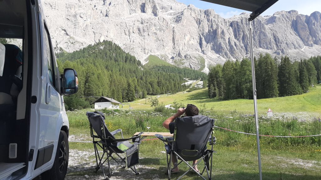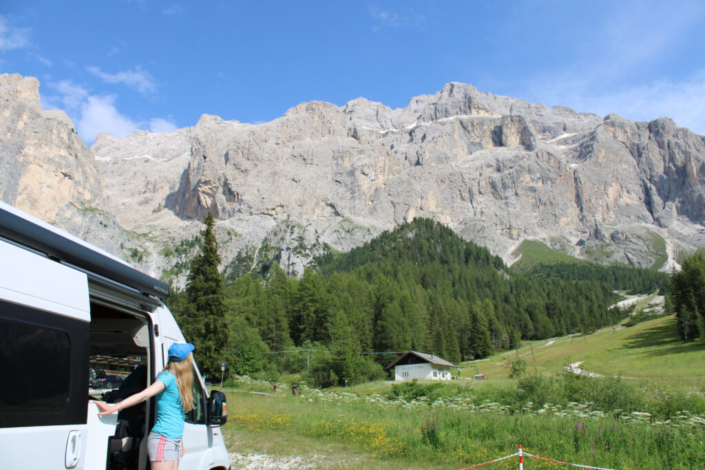Dort mittags angekommen hatten wir einen malerischen Wohnmobilstellplatz mit Blick auf das Sella Massiv, den wir nutzten, um die erste Wäsche zu waschen, ausgiebig zu brunchen und die Sonne zu genießen.