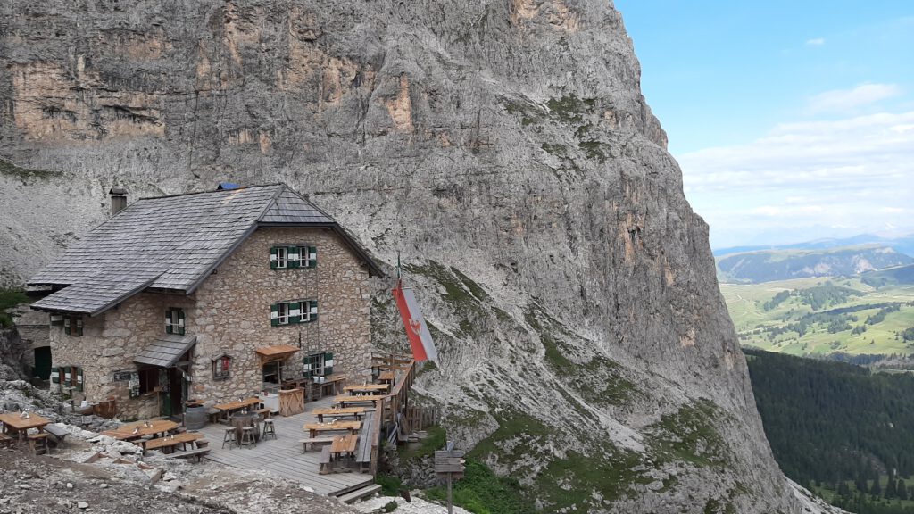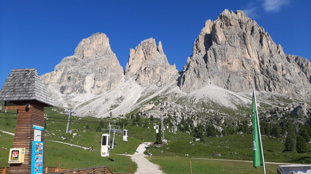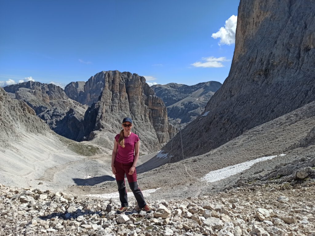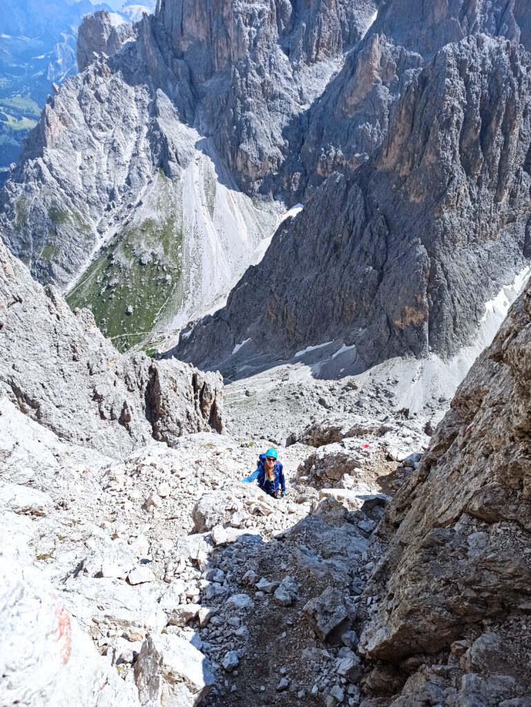 Am nächsten Morgen brachen wir früh auf, um mit Unterstützung der uralten Gondelbahn vom Sellajoch zur Langkofelscharte zu kommen. Dort führt der Weg steil hinunter in das Langkofelkar, von dort hinauf durch das Plattkofelkar zum Oskar-Schuster-Steig, der in leichter Kletterei / mit Versicherung (B/C) bis auf den Plattkofel (2958m) führt. Der Ausblick vom Plattkofel war beeindruckend!