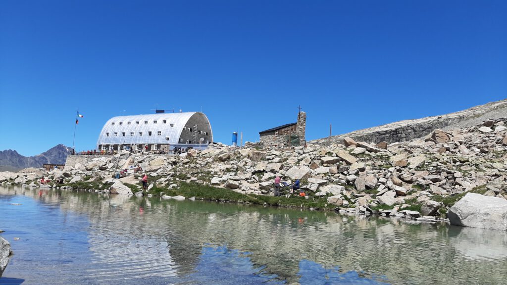 Von dort ging es los am Nationalpark Schild vorbei am schönen Fluss entlang und hoch über viele Höhenmeter und Serpentinen, zum Schluss über Gletschermoränen zum Rifugio Emanuele II, das an einem kleinen Gletschersee gelegen ist. Von der Terrasse eröffnet sich ein herrlicher Blick auf verschneite 3000er.