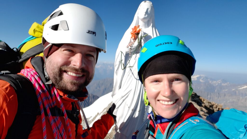 Die Besteigung des Gran Paradiso führte uns weiter über steile Schneefelder und schließlich über den Gletscher mit ein paar wenigen Spalten, aber zwischendurch etwas steil. Die Randkluft zum Gipfelgrat war etwas unheimlich, aber zum Zeitpunkt unserer Besteigung noch gut überquerbar. Der Blockgrat am Gipfel wurde, um den Besucherstrom gerecht zu werden in einen Auf- und Abstiegsweg unterteilt und ist gut mit Stahlstiften und Tritten versichert, aber trotzdem sehr luftig und ausgesetzt! Über eine Leiter geht es zum finalen Aufschwung, wo die weiße Madonna auf dem Gipfel thront! Geschafft! Und was für ein Ausblick!
