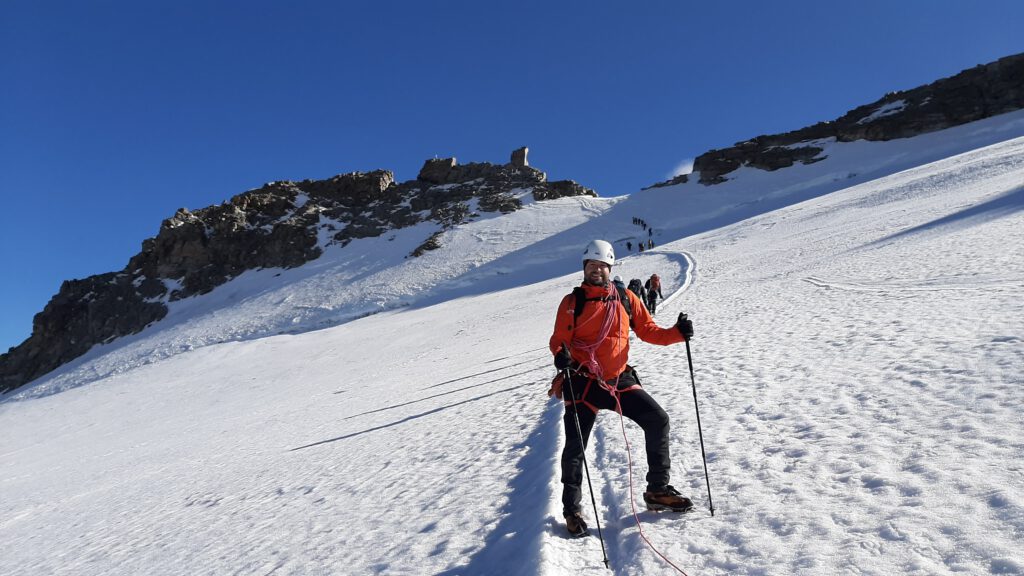 Nach einer kurzen Rast auf der Gouterhütte machten wir uns an den Rest der Tour, eine reine Gletschertour, die in weiteren 1000 Höhenmetern bis auf den Gipfel führt. Der Weg ist lang und zäh, die Luft ist dünn, aber wir haben absolutes Kaiserwetter. Auf diesem Plateau hatten wir einen genialen Ausblick auf den Mont Blanc und die Strecke, die noch vor uns lag. Von dort aus dauerte es noch 3h auf den Gipfel!