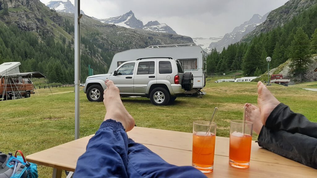 Zurück auf dem Parkplatz nach einem langen Tag und vielen Höhenmetern, haben wir unseren Camper direkt ein paar Meter umgeparkt in den dort anliegenden Campingplatz Camping Breuil. Der war zwar nicht ganz günstig (ca. 30€), aber wir wollten nur noch den Nachmittag genießen, nicht mehr Auto fahren und ausgiebig duschen. Außerdem hatten wir das Bedürfnis, direkt unsere Füße hochzulegen und Spritz zu trinken auf unseren Gipfelerfolg!