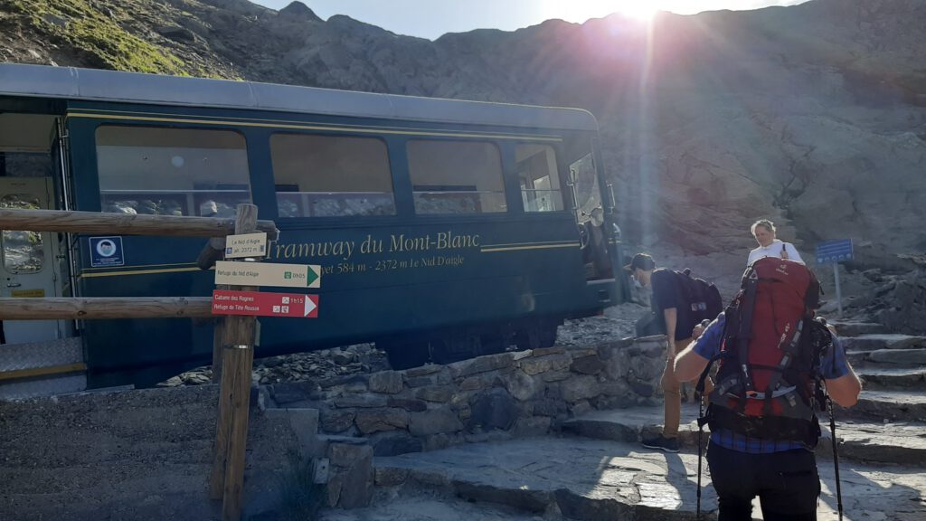 Mit der ersten Gondel „Bellevue“ von Les Houches ging es auf die Hochebene, von dort weiter mit der nostalgischen Zahnradbahn „Tram du Mont Blanc“ durch wunderschöne Hochgebirgs- und Gletscherlandschaft zur Endstation Nid d’Aigle auf 2372m. Von dort geht der Hüttenzustieg über die steinige Gletschermoräne des Tete Rousse Gletschers los. Nach vielen Serpentinen und einer kurzen Überquerung des Tete Rousse Gletschers erreichen wir die Tete Rousse Hütte.