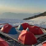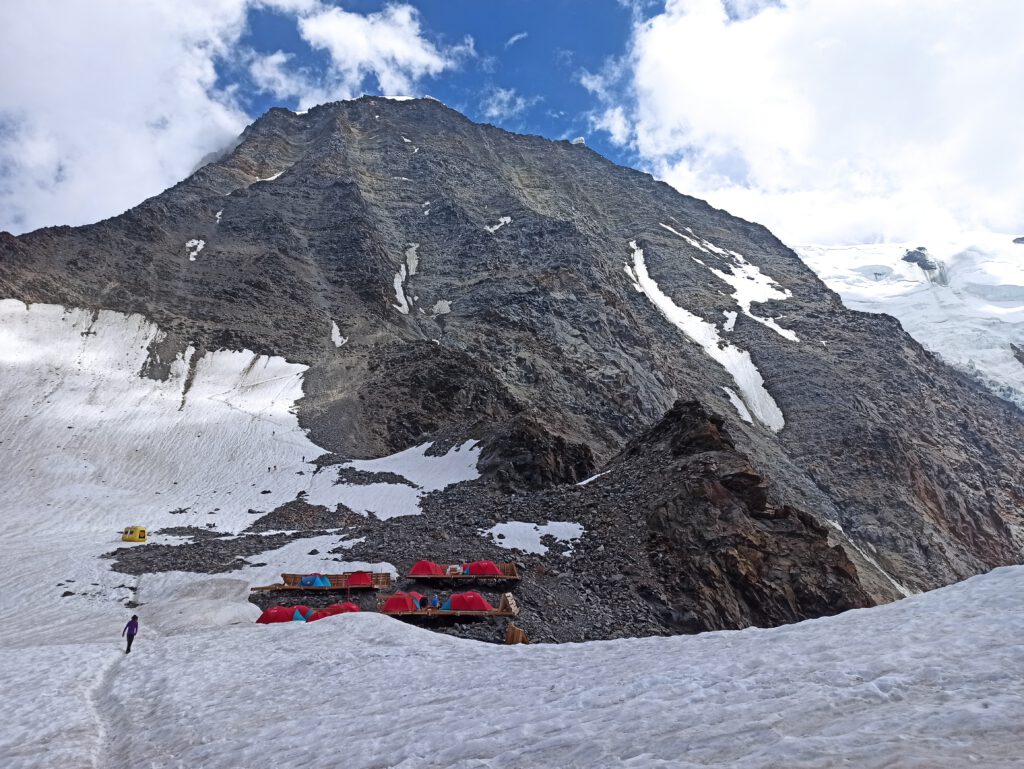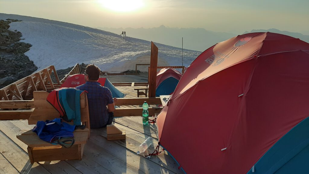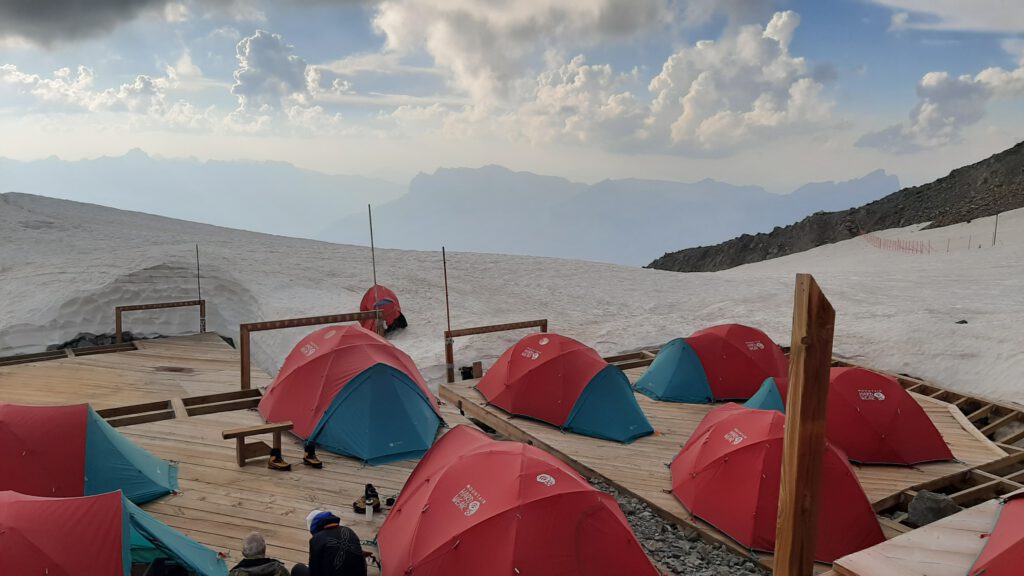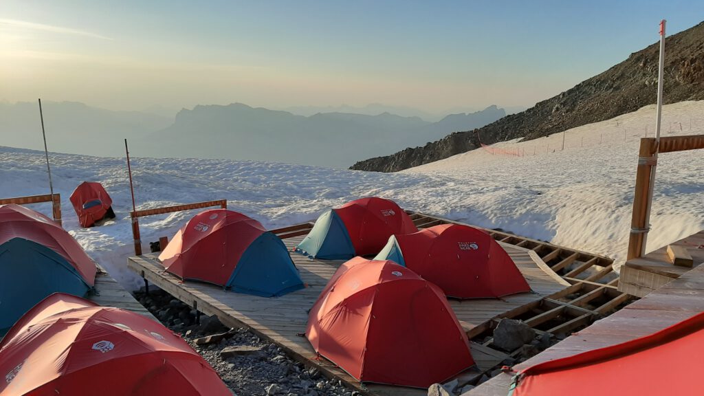 Dort beziehen wir statt eines wenig Corona-konformen Schlaflagers ein mega-cooles Basecamp, das auf Holzplanken auf dem Gletscher befestigt ist- mit Blick auf den Weiterweg, das berühmt-berüchtigte, steinschlaggefährdete „Couloir du Gouter“ und weiter oben das Refuge du Gouter. Zelten auf 3000 Metern auf einem Gletscher! Eine coole aber auch unbequeme Erfahrung, leider mit einem mächtigen Gewitter nachts und Neuschnee vor dem Zelt am frühen Morgen!