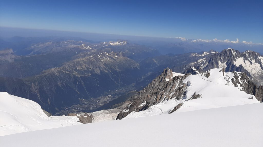 Der Ausblick vom Mont Blanc ist deshalb so einzigartig, weil das Tal daneben (Chamonix) 4000m tiefer liegt. Es wirkt also so, als würde man von einem Flugzeug ins Tal blicken!