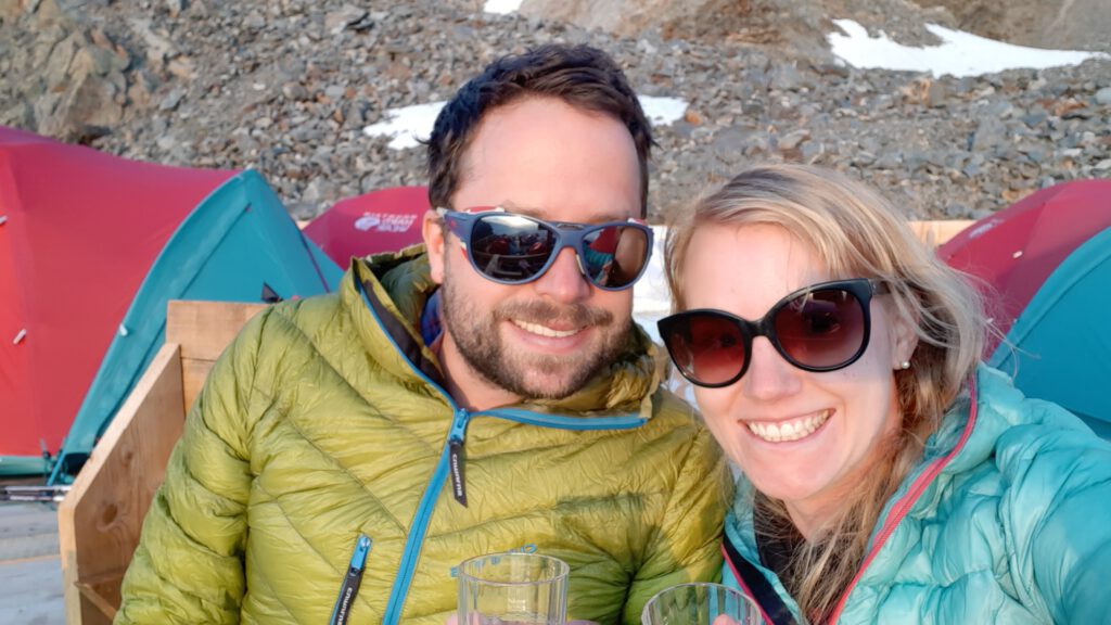 Was für eine Tour!… die letzten Meter rutschte ich auf dem Hosenboden zum Zelt. Wir kauften uns eine Flasche Wein, um im Sonnenuntergang auf unseren Gipfelerfolg anzustoßen aber auch auf unser Glück, das wir heute hatten.