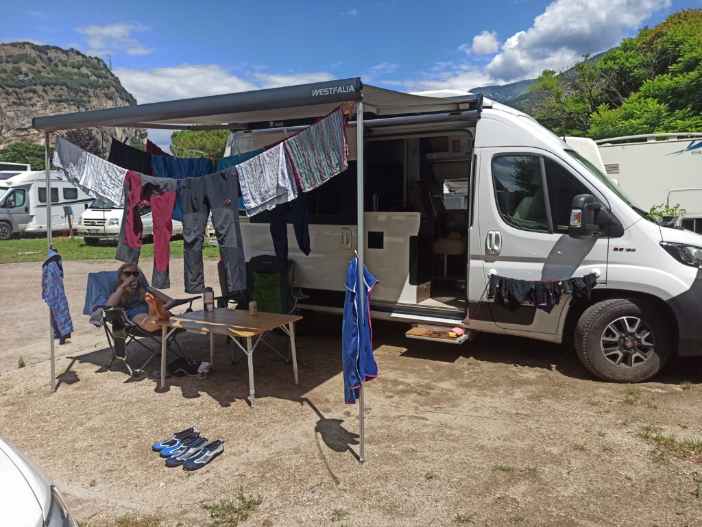 Am Gardasee standen wir am Camper Stop Torbole, den wir sehr empfehlen können. Er funktioniert ohne Reservierung und mit Schranke. Er ist kein offizieller Campingplatz, bietet aber trotzdem die üblichen Waschräume und einen kleinen Shop, ist aber etwas günstiger und trotzdem direkt am See bei Torbole.